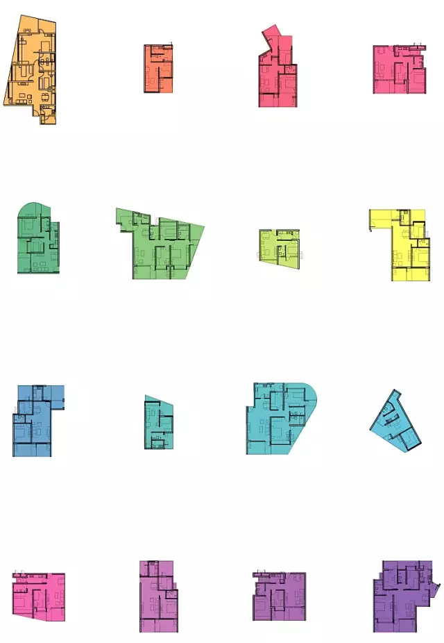 住宅平面布局采用平直与倾斜的形态,使得小区空间收放有度,严谨而不失活泼。户型设计针对深圳的气候特征和业主对户型平面的要求,从生态建筑学的角度出发,充分利用自然采光通风,降低能耗,将平面花园引入高层建筑。电梯厅、前室和每家每户每个房间都能具备自然通风采光,强调功能分区,把动态的起居空间与静谧的卧室空间以服务区来分隔,使每一位居民的居住质量得以提高。