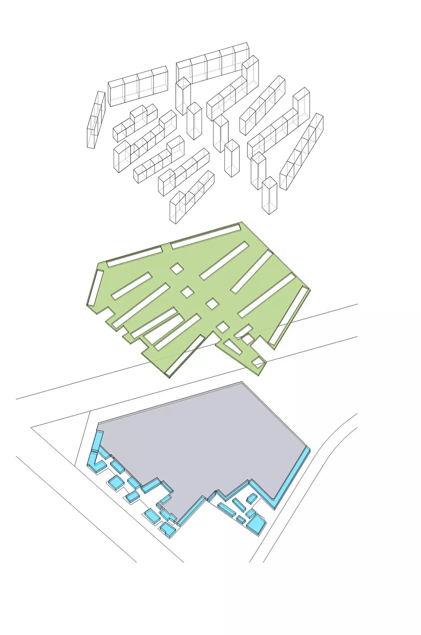 平台之上的建筑群体是小区的业主居住空间,呈闪电型布置,使围合空间有收有放;中央绿带中布置高层塔楼,如群星点缀其间。通过将居住区作为一个整体来处理,居民既可以通过楼座中的直梯直达室外花园活动、到商业街购物,方便却又不受外来者干扰。利用台地的高差错落,将居住空间托起的同时又将商业街区、景观绿化、休闲空间、人流动线和交通系统等脉络化、层次化,并配合形成了立体穿插、流动且多层次的环境空间,强调社区居民与外来人群之间对空间的参与性与互动性。