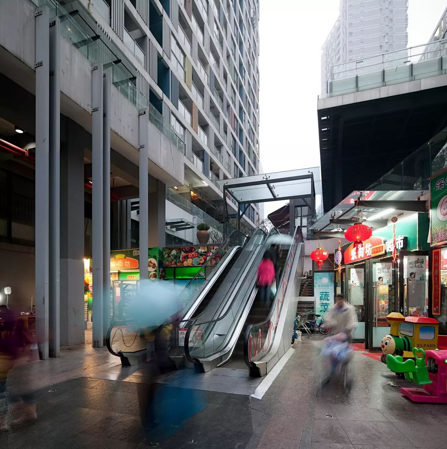 平台下部空间的外围面向城市全部开敞,台地在南区和西区形成完善的都市生活带,凹入式的内院广场和贯穿其间的步行街为人们提供了尺度宜人的社区商业。通过开放式社区的方式将都市化与居民日常生活结合。底层商业围绕社区发展,随着一定的进深与内部空间相互渗透,形成有联系的城市界面,而不是独立的点,也更方便居民生活使用。