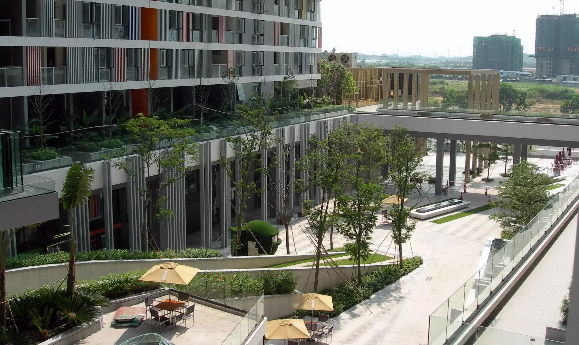 为了规避社区开放后对居住者专属景观休闲空间的侵占,平台顶部即商业上方通过台地形成连续完整的空中花园,通过环境和都市商业的叠加,使二者都得到最大的发展。小区内建筑物底层架空,带给花园充足的日照与良好的通风,使景观带得以连续,形成整体专属景观花园。