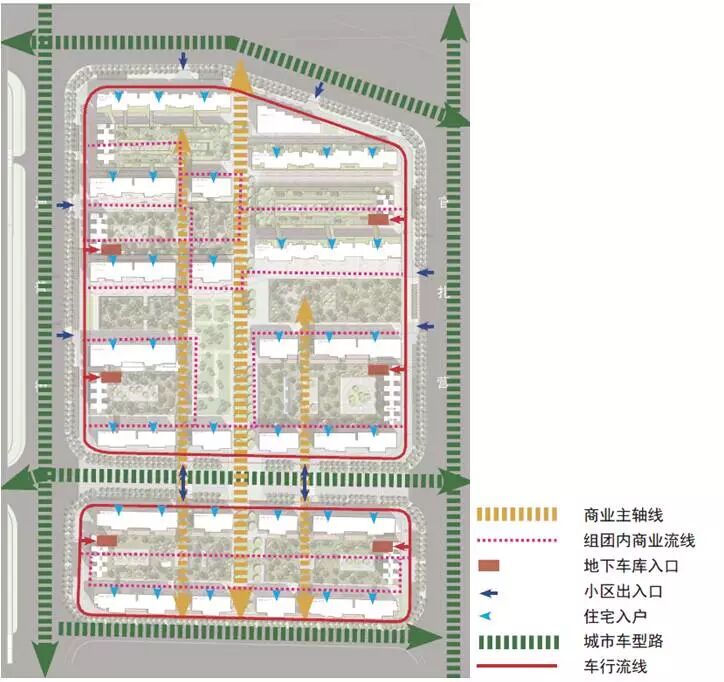 今天的济南世茂天城其规划沿用了“密路网、小街坊、窄街道”的设计理念,既提高了社区的线密度(即每平方公里内向公众开放的有人行道的街道长度),还原了德国殖民时期济南原有的街区肌理,又独创“发梳理论”,改良了传统鱼骨式理论中鱼刺两侧尽端式胡同的做法,采用鱼刺端头全部打开、无限延展的方法,将地块四周面向车流、商铺人流、业主、访客全部开放、按需有序引导,因此更像是发梳一样,通过合理的缜密的梳理引导,为社区舒筋活血,从而提升社区的活力与生命力。