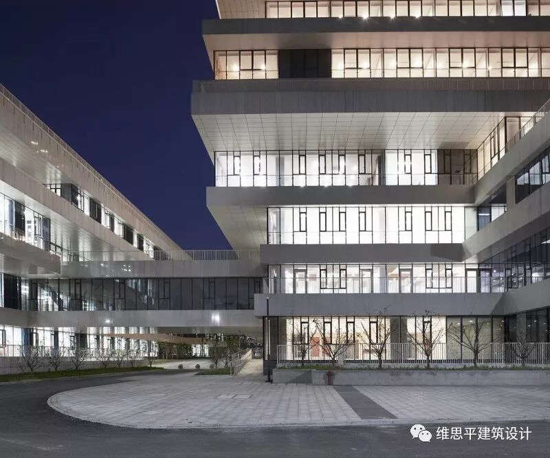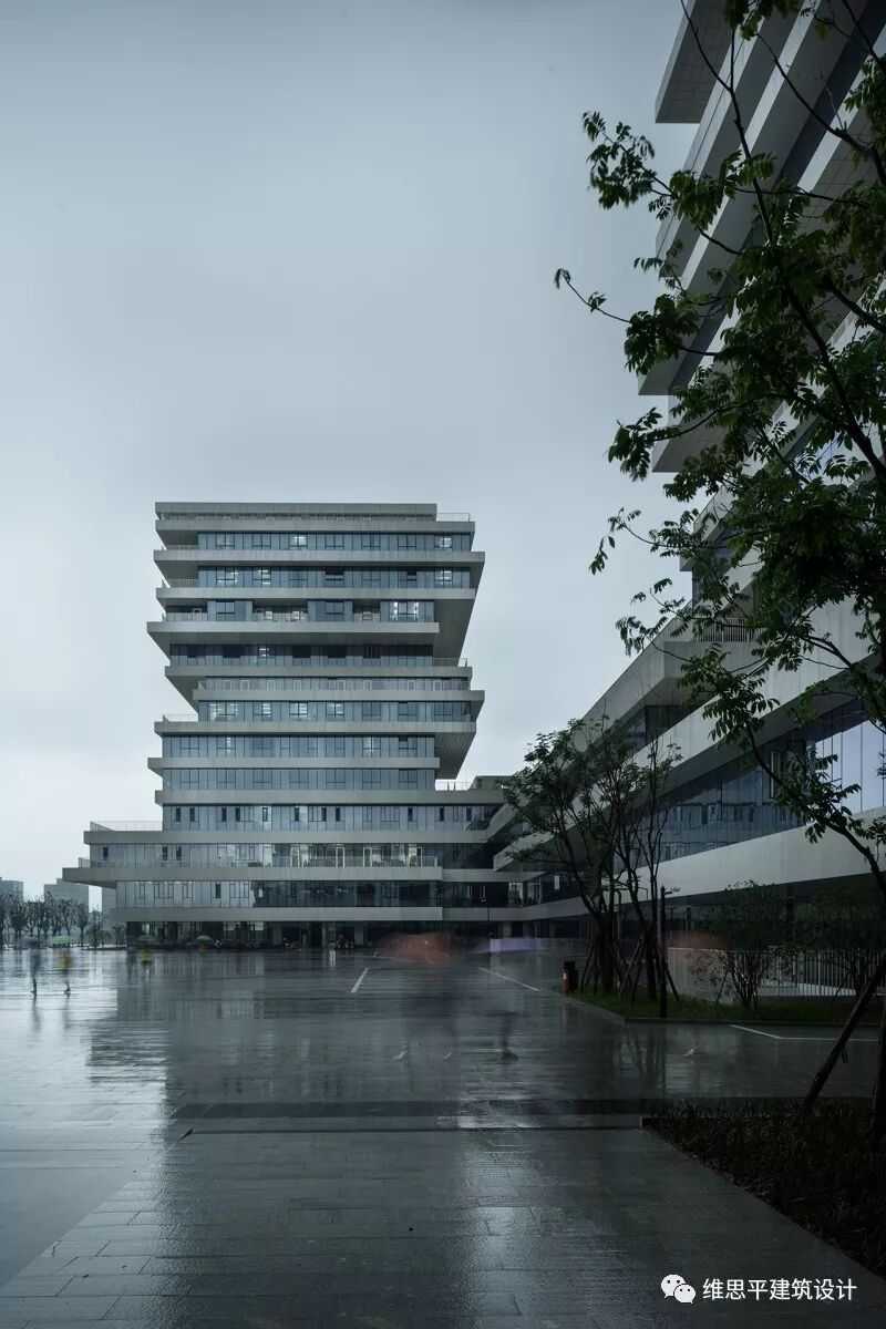 建筑设计基于一个严格的模数体系,用于控制这个复杂功能综合体的所有平面、立面和建造细节,确保用经济合理的成本,实现一个高质量的建筑,并为日后的运营维护减轻负担。在标准化模数体系和最直接的框架结构之外,建筑呈现给师生的是一个柔和多变的形像,表达了我们对杭州城市性格的理解。联桥、退台、内庭、挑檐等等形式既是功能互联、室外活动、通风、遮阳等使用功能的直接反映,同时也减小了建筑的体量感,做为规划定义的校区制高点,我们想让它看起来只是风景中的眺望平台,在这里眺望校园,眺望老街,眺望自然。